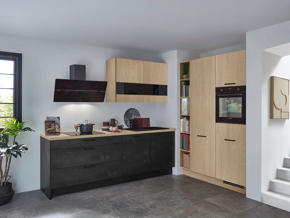 Façade : Mélaminé des deux côtés, avec chants polymère soudés au laser assorti à la façade sur tout le pourtour. Intérieur de porte assorti à la façade
