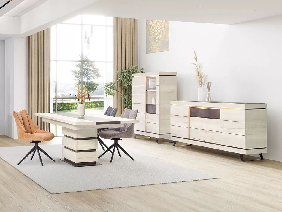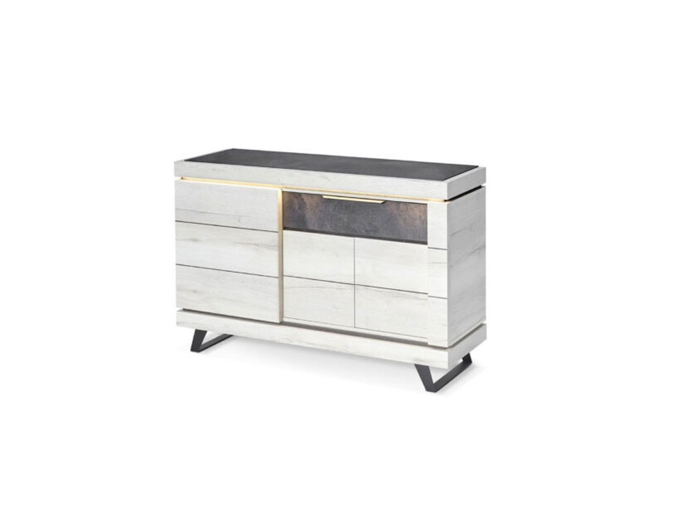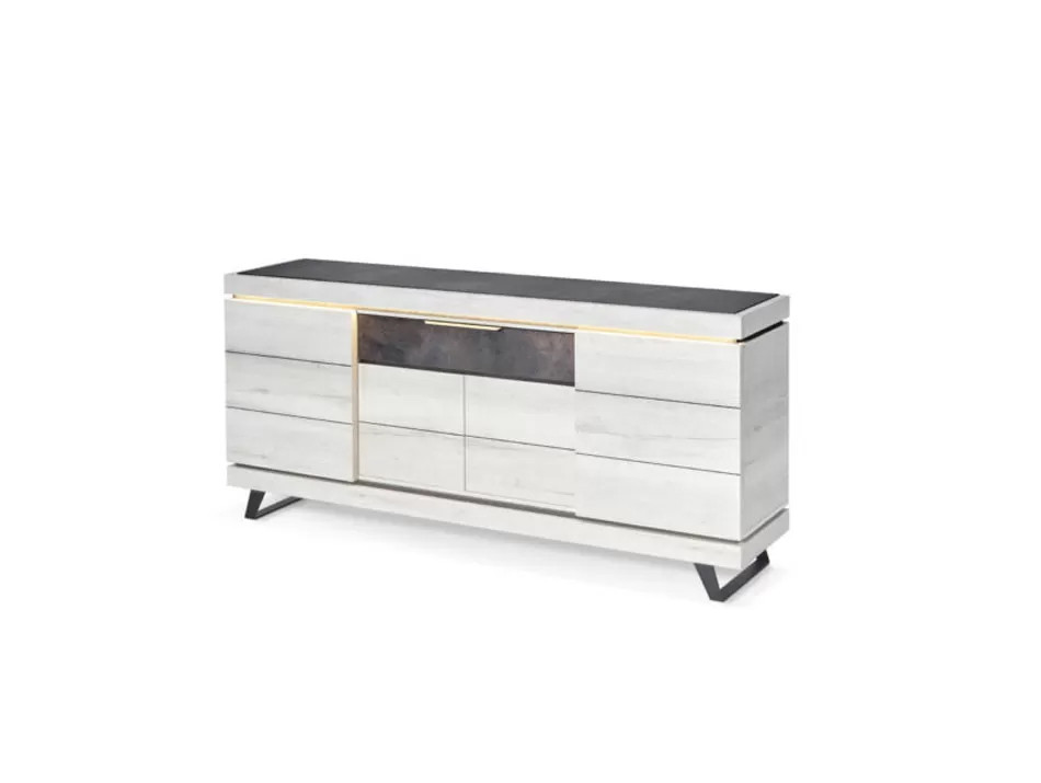Structure : Panneaux de particules ou MDF avec mélamine haute qualité. Piétement : Métal finition poudre noir mat Information centrale : Photos non contractuelles Articles vendus séparément Préassemblé mais démontable Origine du produit : Union européenne Composition : Portes montées sur charnières métalliques avec amortisseur Led économique INCLUS