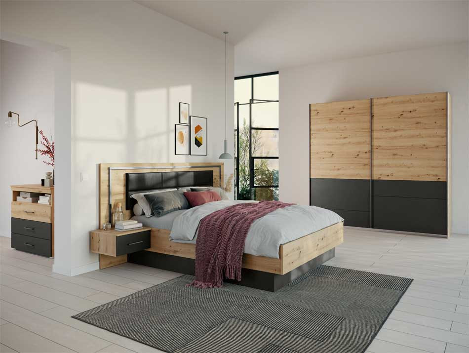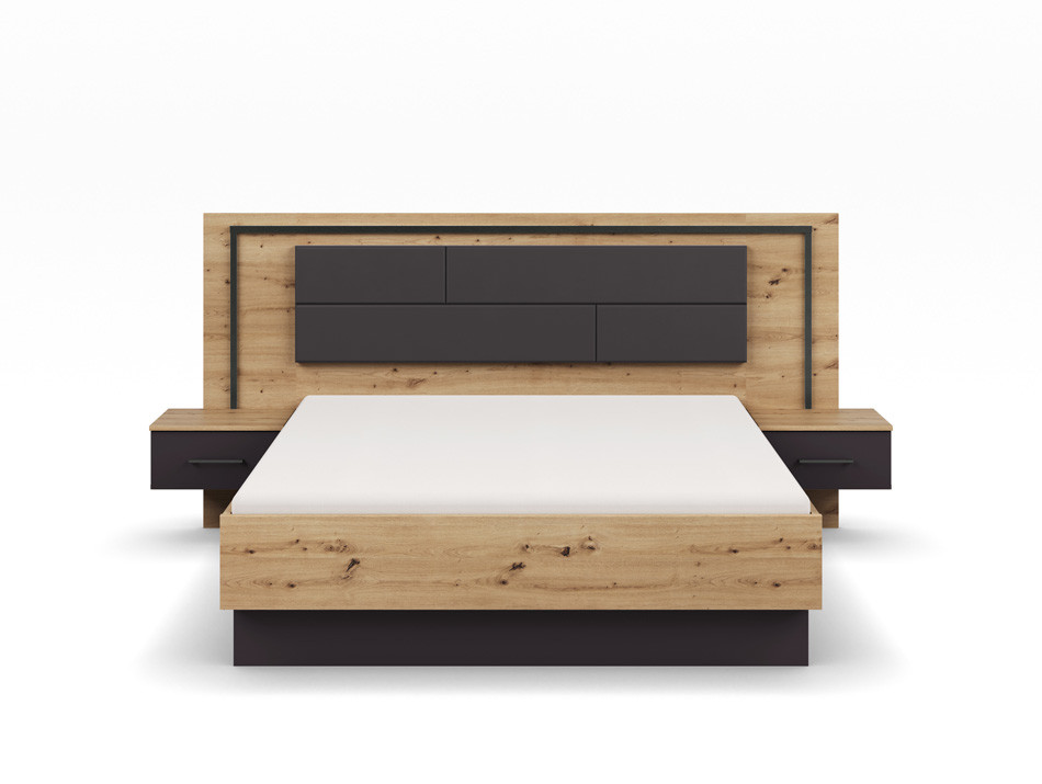 Descriptif : Structure mélaminée avec décor imitation imprimé Origine du produit : Allemagne Information centrale : Photos non contractuelles Articles vendus séparément Garantie Atlas : 10 ans Composition : - Tête de lit rembourrée décor chêne artisan et gris métal. - 2 chevets attenants avec tiroirs - Cadre de lit bicolore décor chêne artisan et gris métal - Eclairage avec transfo Plus produit Atlas : Existe en couchage : - 160x200 dimension totale L245xH109xP227 cm - 180x200 dimension totale L265xH109xP227 cm
