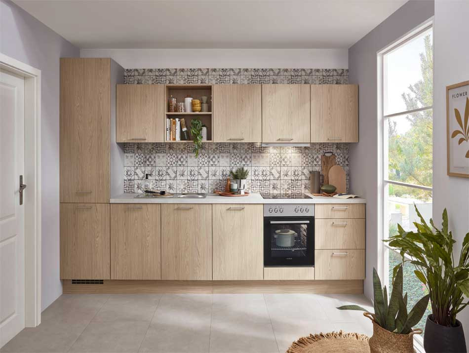 Façade : Façade en mélaminé avec chants PVC assorti à la façade sur tout le pourtour. Intérieur de porte assorti à la façade. Corps des meubles : Panneaux de particules surfacés mélaminées, épaisseur 16 mm. Plan de travail : Panneaux de particules, épaisseur 38 mm, stratifiés. Socle : Panneaux de fibres de bois moyenne densité, épaisseur 13 mm. Garantie Atlas : 10 Ans pour les meubles 5 ans pour les accessoires 2 ans pour l'électroménager et sanitaire La durée de garantie commence toujours à partir de la date de livraison Prestations : Livraison et pose par des professionnels certifiés sur devis Information centrale : Le prix exprimé inclus le mobilier et les appareils électroménagers listés, hors prestations de pose et de livraison. Toute modification de finitions, de configurations ou de dimensions pourra entraîner une tarification sur mesure. Photos non contractuelles Electroménager : - Evier RODI/87100, 1 bac + 1 égouttoir, inox - Mitigeur CARLO NOBILI/17772, haute pression finition chromé - Four BEKO/BBIM113N1X, hydrolyse coloris inox et verre noir - Lave-vaisselle WHIRLPOOL/WDINC326CS, tout intégré 8 programmes - Table de cuisson BEKO/HII63400MT, induction - Hotte ELICA/ELITE1460D, télescopique coloris gris/inox - Réfrigérateur BEKO/BCSA285K4SN, volume utile réfrigérateur 193 litre, volume utile congélateur 78 litres Meuble : - Colonne réfrigérateur intégré 2 portes L60xH201xP56 - Façade lave-vaisselle tout intégré L60xH72 - Bas sous évier, 2 portes d'un tenant L120xH72xP56 - Elément bas four, 1 bandeau fixe L60xH72xP56 - Elément bas 1 tiroir, 2 coulissants L60xH72xP56 - Elément haut 1 porte L60xH57xP36 - Elément haut ouvert L60xH57xP36 - Elément haut 1 porte L60xH57xP36 - Elément haut pour hotte télescopique L60xH57xP36 - Elément haut 1 porte L60xH57xP36 - P