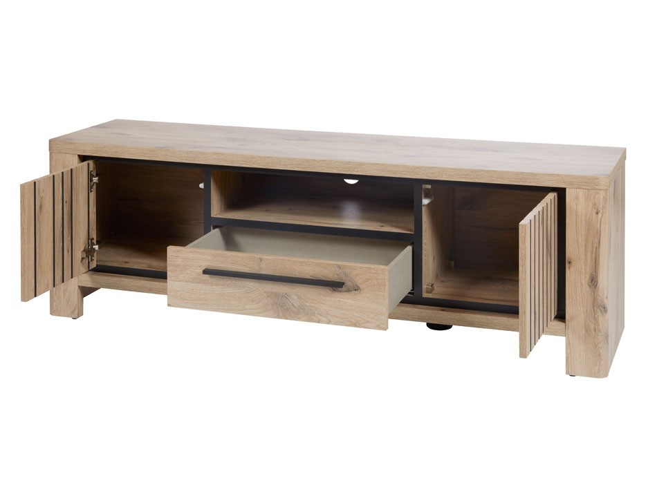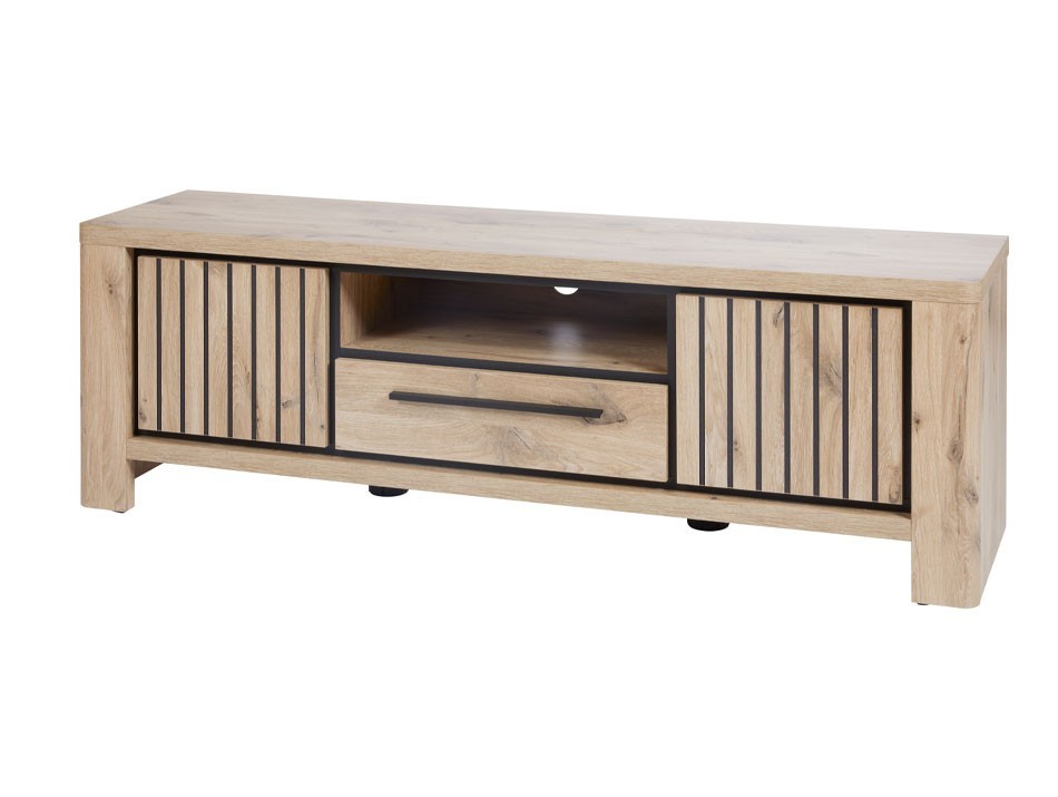 Structure : Panneaux de particules revêtus de papier décor imitation bois Information centrale : Photos non contractuelles Articles vendus séparément Origine du produit : Union européenne Composition : 2 portes montées sur charnières avec amortisseurs 1 tiroir avec coulisses métalliques 1 niche avec passages pour les câbles