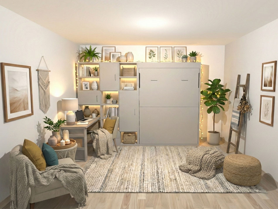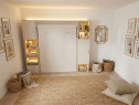 Composition : Colonne gauche bibliothèque 58 + Porte Bibliothèque 1 Niche + Plateau de Bureau + Pied de bureau à étagères + Colonne gauche bibliothèque 48 x2 + Caisson 2 Tiroirs + Porte Bibliothèque 2 Niches + Porte Bibliothèque 3 Niches + Côté Droit Bibliothèque + Lit escamotable Verticale + Option prise USB + Option LED + Option 2 couvertures pistons.