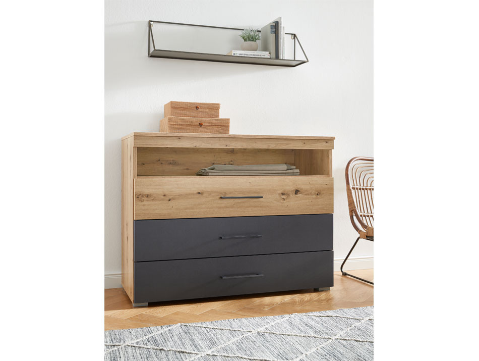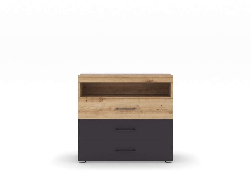 Composition : 3 tiroirs avec glissières métalliques silencieuses montées sur des roulements à billes. Intérieur du meuble en décor imitation Texline.