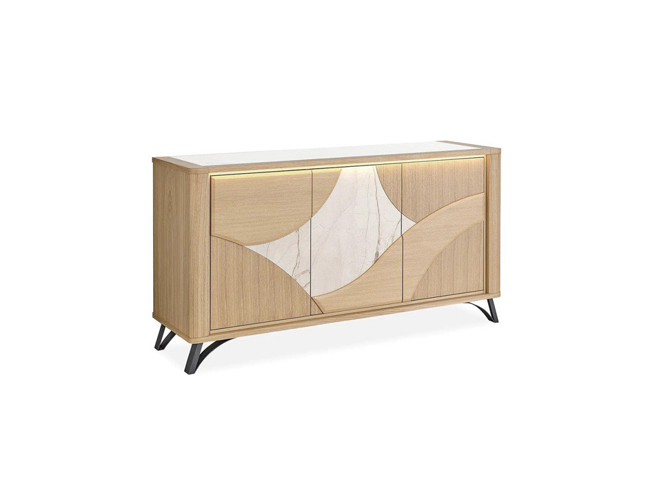 Structure : Panneaux de fibres moyenne densité revêtus de placage chêne avec incrustation céramique beige veinée ou brun panaché (Dekton) pour les portes bois