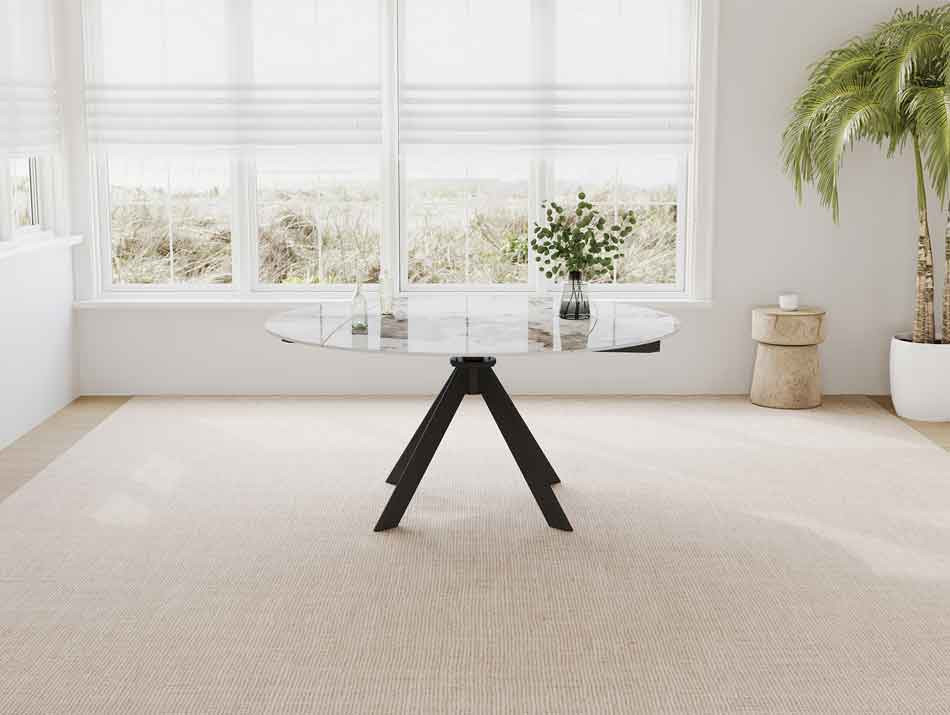Allonges : Dessus céramique Elysium épaisseur 12 mm, 2 allonges en bout suivi du veinage. Dimension ouverte 150 cm