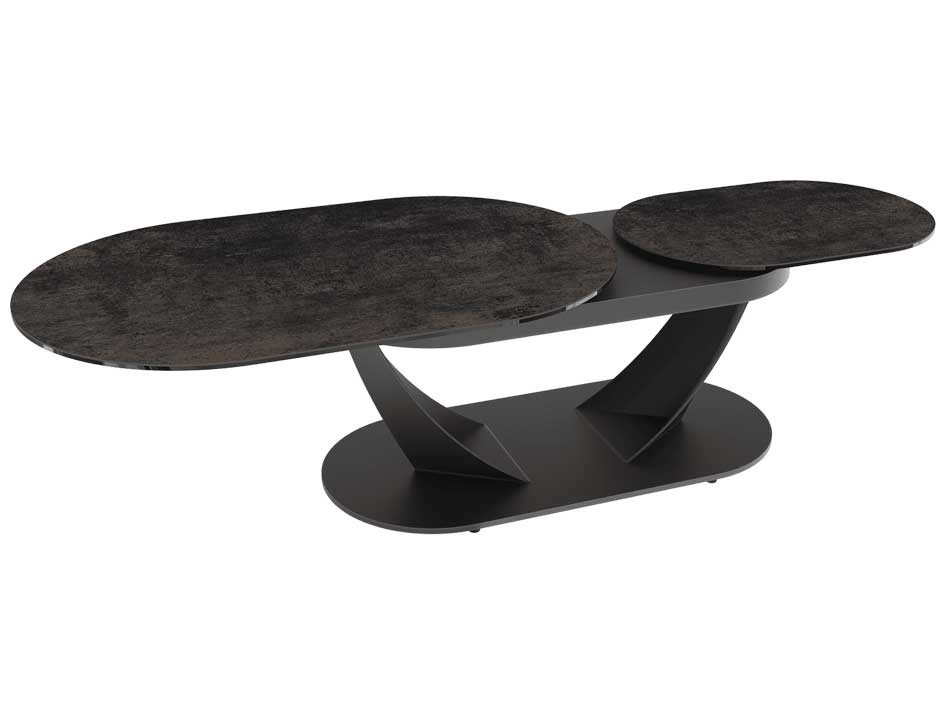 Plateau : 2 plateaux ovales pivotants à 360° en céramique épaisseur 3 mm collée sur verre épaisseur 6 mm